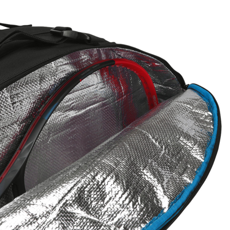 - Detalhamento: Raqueteira possui 3 compartimentos para as raquetes, sendo que um deles tem a proteção térmica, todos com fechamento em zíper, acomoda até 9 raquetes sem capa ao todo, possui um bolso externo amplo com fechamento em zíper epara acomodar outros acessórios e/outros pertences com um bolso interno telado, bolso em uma das laterais com forro flanelado, bolso na região frontal para acomodação de um par de calçados, alça de mão reforçada, alça de ombro com regulagem e acolchoada;