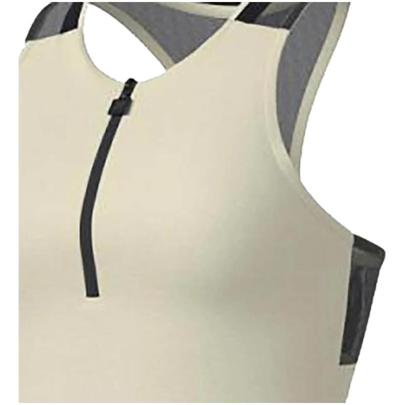 - Detalhamento: Possui gola retilínea, decote V com zíper, e costas em decote nadador com tecido respirável, com o logo da Fila na parte superior das costas. Possui forro frontal, saia evasê e caimento tradicional,